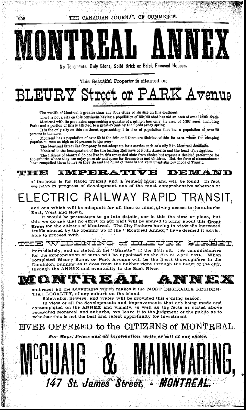 Publicité de McCuaig & Mainwaring en faveur du tramway électrique, Canadian Journal of Commerce, 3 avril 1891.